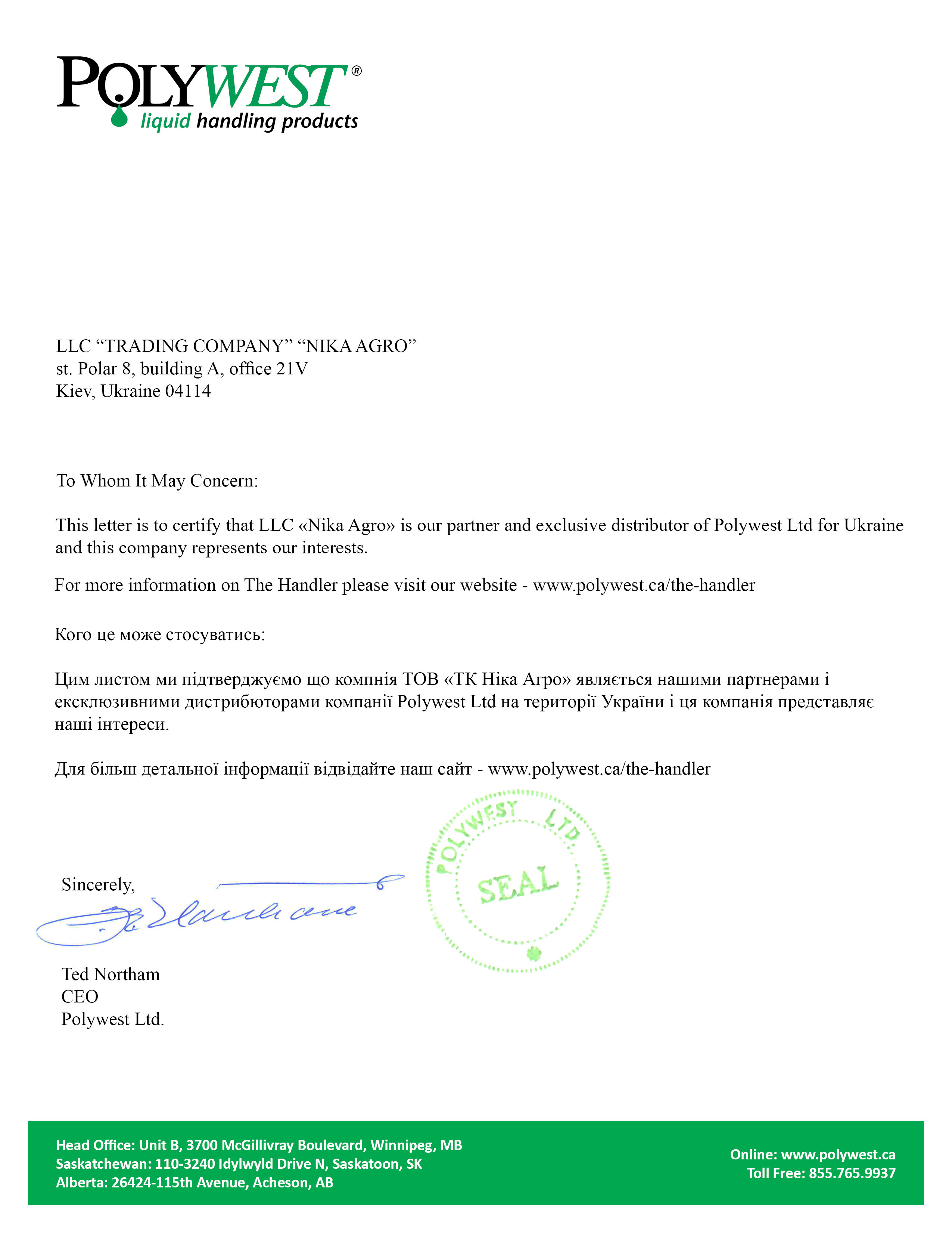 Обращаем внимание заинтересованных клиентов – с 1 января 2018 года мы получили статус эксклюзивного поставщика смесителей маточного раствора от канадской компании Polywest, подтвержденный соответствующим сертификатом.